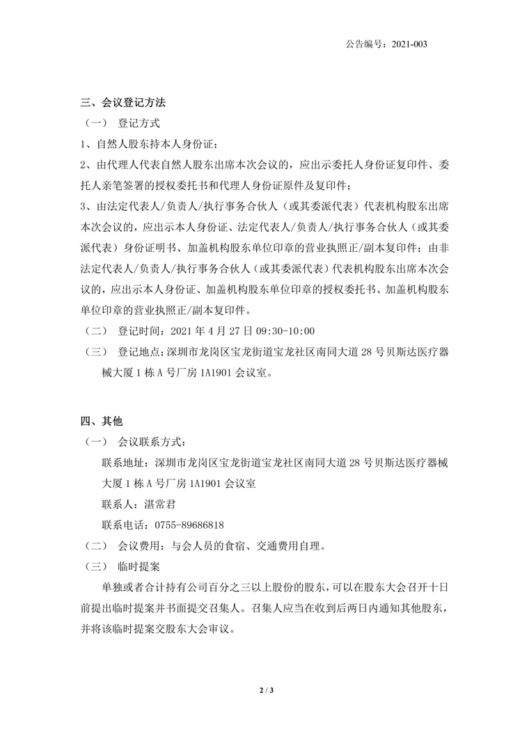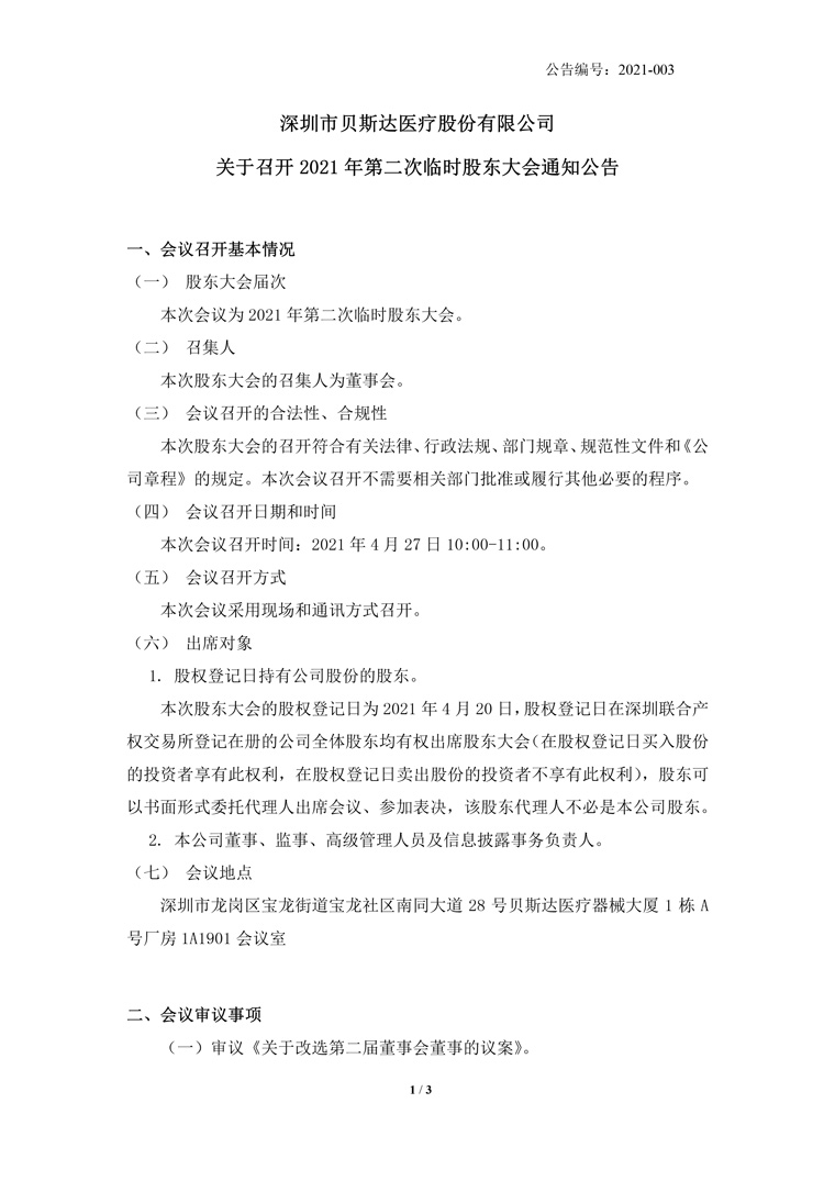 2021-003-貝斯達(dá)-關(guān)于召開2021年第二次臨時(shí)股東大會通知公告